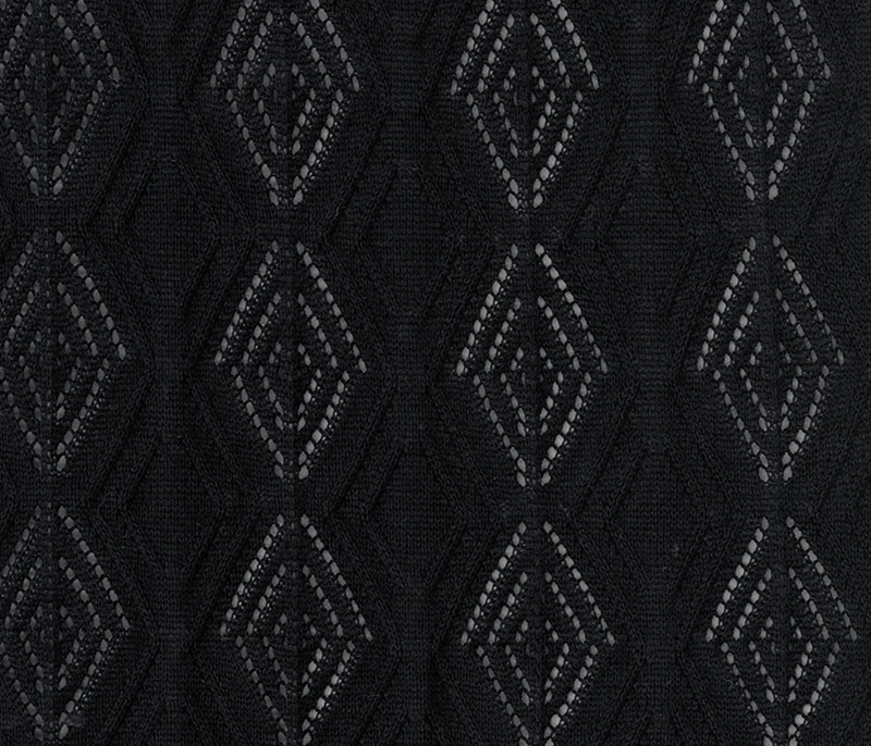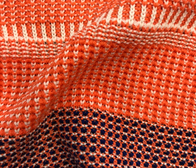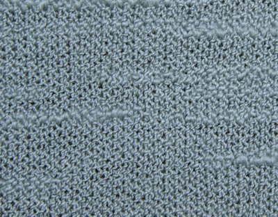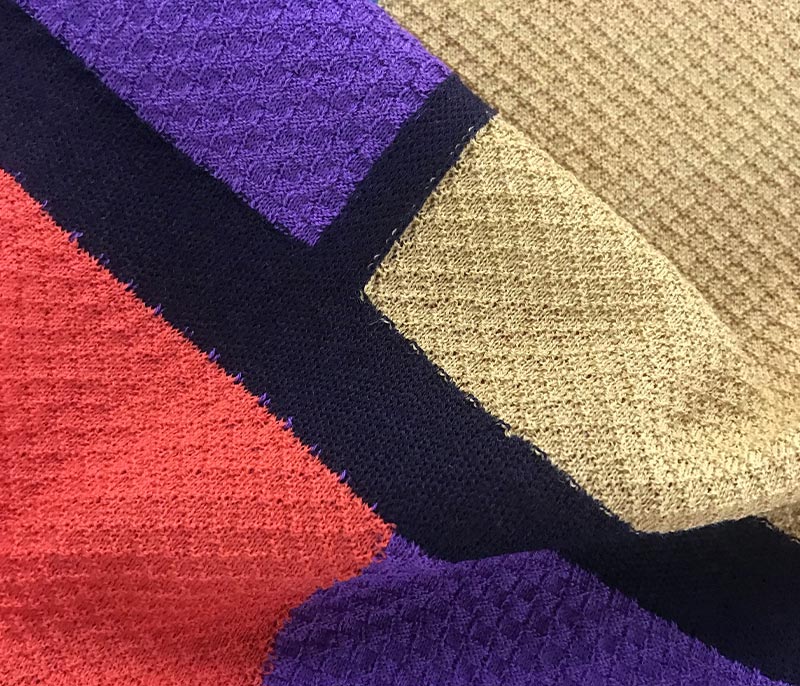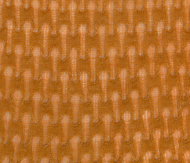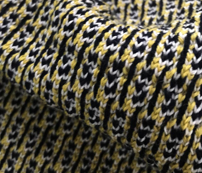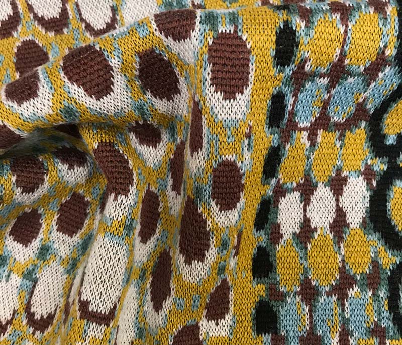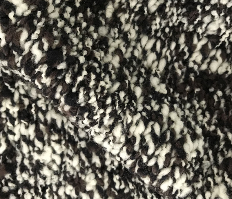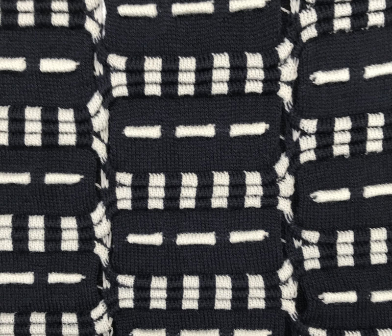 Patterned inlay yarn with buttoned appearance and rich composition.